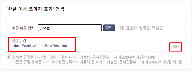 '김연희'라는 이름으로 검색한 결과가 잘 보여집니다. 기본적으로 2개의 로마자 표기 방법을 알려주고 있네요. [Gim Yeonhui, Kim Yeonhui]로 표시되는 것을 알 수 있습니다. 여기서 조금 더 기능을 이용해보도록 합니다. 오른쪽에 있는 '더보기'를 선택합니다.