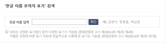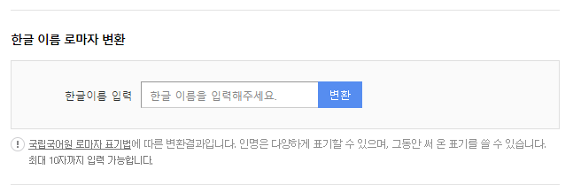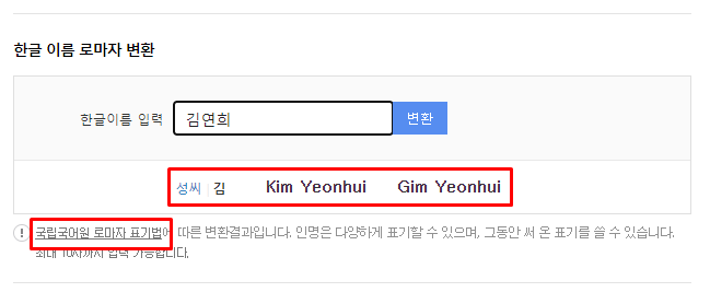 '김연희'로 변환한 로마자 변환 결과를 쉽게 확인할 수 있습니다. [Kim Yeonhui, Gim Yeonhui]의 2가지 변환 표기 방법을 알려주고 있습니다. 아쉽지만 더 많은 정보를 얻지는 못하기는 합니다. 1번에서 알아본 빈도에 대한 정보는 해당 기능에서 확인하기 어렵기도 합니다. 대신, '국립국어원 로마자 표기법'에 대한 정보를 바로 확인할 수 있습니다. 해당 정보를 이용해 원하는 표기법으로 만든 다음 정확한 방법인지 체크해볼 수는 있을 것 같네요.