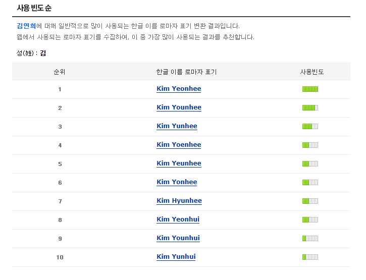위 사진은 '더보기'를 선택했을 때 볼 수 있는 페이지의 일부 내용을 보여주고 있습니다. 10개의 로마자 표기로 표시된 이름들이 나열되어 있는데요. 해당 번호는 사람들의 사용 빈도를 기준으로 나열된 것임을 보여주고 있습니다. 오른족에 있는 막대그래프는 빈도의 정도를 그림으로 표시한 부분입니다. 만약, 남들과는 차별화를 두고 싶다면 사람들이 많이 선택하지 않은 이름을 사용하면 좋겠죠.