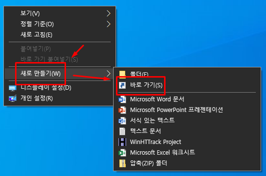 윈도우 바탕화면에는 바로가기를 만드는 기능을 제공하고 있습니다. 바탕화면에서 마우스 오른쪽 버튼을 클릭합니다. '새로 만들기'를 선택합니다. 하위 메뉴에서 '바로 가기'를 선택합니다.