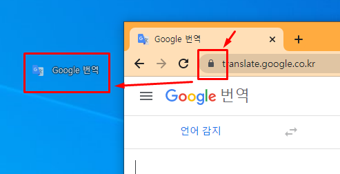 웹브라우저에서 구글 번역기 사이트에 접속하도록 합니다. url(주소)를 입력하는 부분에 아이콘이 있습니다. 해당 아이콘을 '드래그 앤 드롭' 방식으로 윈도우 바탕화면으로 끌어다 놓습니다.