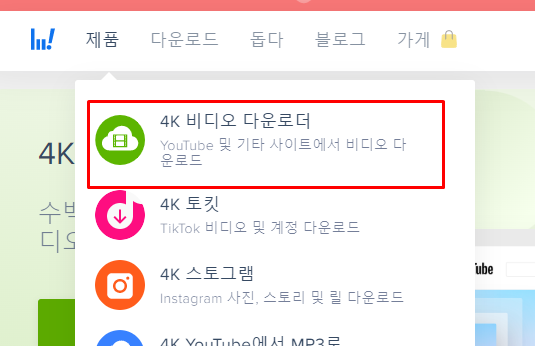 위 사진은 4kdownload.com의 메인 화면 중 일부의 모습입니다. 여기에는 여러 프로그램이 있는데요. 위 사진에서 표시된 부분과 같이 4K 비디오 다운로더를 사용하면 유튜드 다운로드를 이용할 수 있습니다. 해당 방법은 별도의 프로그램을 설치하여 사용하는 것이기 때문에 설치 파일을 다운로드 해야만 합니다.
