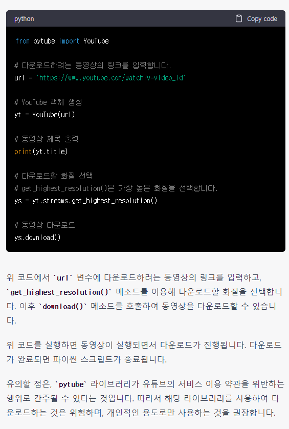 ▲ 위 사진은 ChatGPT가 알려준, pytube 사용법에 대한 내용의 일부입니다. 상세하게 알려주고 있지만, 핵심은 파이썬 코드니까요. 해당 부분만 갈무리하였습니다. 참고가 되면 좋을 것 같네요.