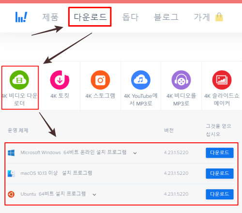 위 순서를 이용하여 4K 비디오 다운로더를 이용할 수 있습니다. 지원되는 플랫폼 os로 윈도우 / 맥 / 우분투가 있습니다. 사용하려는 os에 맞는 프로그램을 다운로드하여 설치 후, 활용할 수 있습니다.