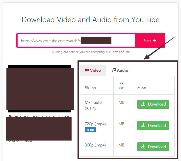 위 사진은 임의의 영상 링크를 이용해 y2mate.com의 기능을 사용한 결과입니다. Video 그리고 Audio로 구분하여 다운로드 파일을 지원하는 것을 알 수 있습니다. 또한, 동영상의 경우 다운받을 수 있는 해상도를 선택할 수 있는 부분도 눈에 띄는 것 같네요. 다만, 플레이 시간이 너무 긴 경우 다운로드를 지원하지 않기도 합니다.