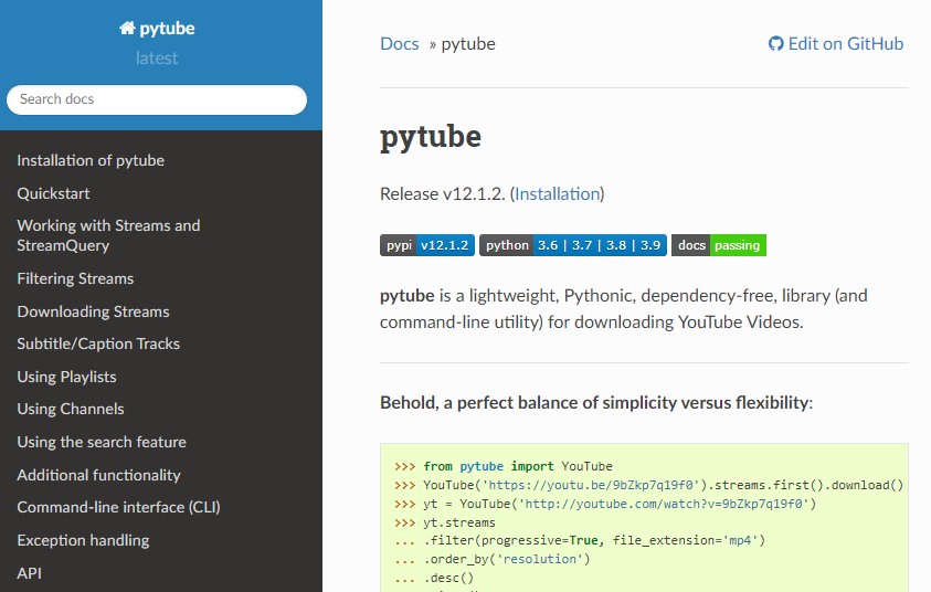 위 사진은 pytube의 공식 사이트 모습의 일부입니다. 여기서 잘 살펴보면 기본적인 사용법과 옵션을 알아볼 수 있습니다. 영어라 부담스럽게 느껴진다면, 크롬웹브라우저의 실시간 번역기 기능을 이용하는 것도 좋은 방법이 될 수 있습니다.