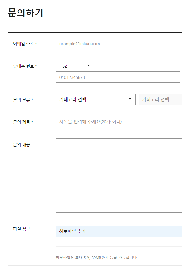 위 사진은 문의하기 양식에 대한 참고 예시 사진입니다. 여기에는 이메일주소, 휴대폰 번호, 문의 분류, 문의 제목, 문의 내용, 파일 첨부등의 양식이 있습니다. 각 양식의 이름 옆에 *표가 붙어 있다면 필수 사항이기 때문에 꼭 기입한 후, 문의를 진행해야만 합니다. 또한, 카카오 계정으로 로그인을 할 수 있지만, 꼭 로그인을 하지 않아도 충분히 문의하기를 진행할 수 있습니다.