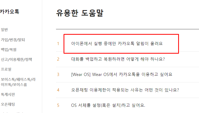 예를 들어, 카카오톡 카테고리를 선택했다고 가정합니다. 사이드바에 '카카오톡'이라는 메뉴가 있습니다. 여러가지가 있죠. 원하는 것 혹은 관련 있는 것이 있다면 선택합니다. 오른쪽에는 '유용한 도움말'이 있습니다. 대략 10개 정도 표시가되는데요. 여기서도 원하는 것 혹은 관련 있는 것이 있다면 살펴볼 수 있습니다. 만약, 없다면 임의로 하나 선택합니다.