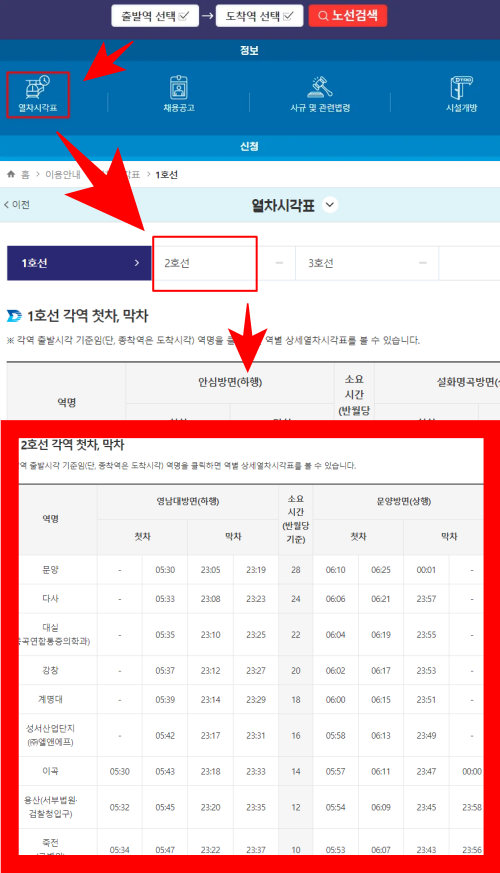 위 사진은 대구교통공사 홈페이지에서 열차(지하철)시각표를 확인하는 과정을 보여주는 예시 사진입니다. 참고하면 도움이 될 수 있습니다.