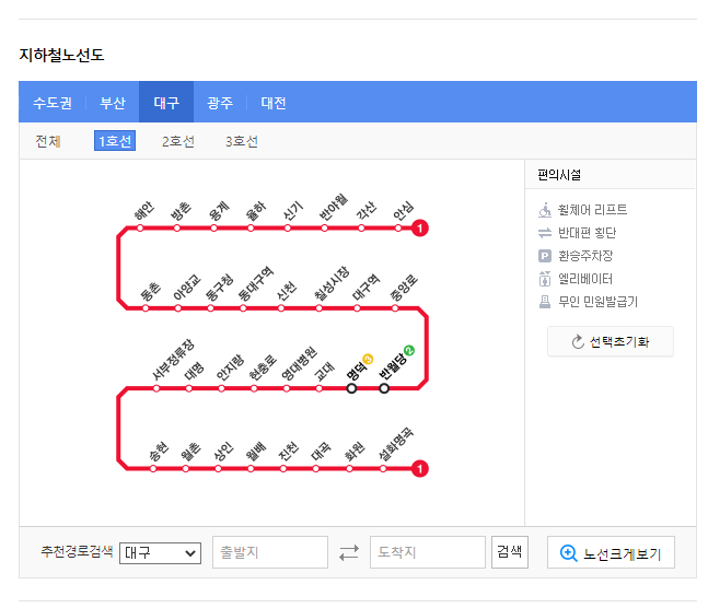사진에서 보여지는 것과 같이 대구 지하철 1호선에 대한 노선도를 확인할 수 있습니다. 더욱이, 전국의 각 지역에 대한 지하철 노선도를 확인할 수도 있습니다. 해당 영역에서 제공되는 기능으로는 '추천경로검색', '출발지와 도착지 검색', '노선크게보기'등의 기능이 있습니다.